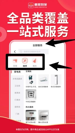 3、进入全部服务页面后,您能够在页面顶部挑选安装、维修、清洗等服务类别,接着在分类列表里找出对应的家电,然后进行下单操作。