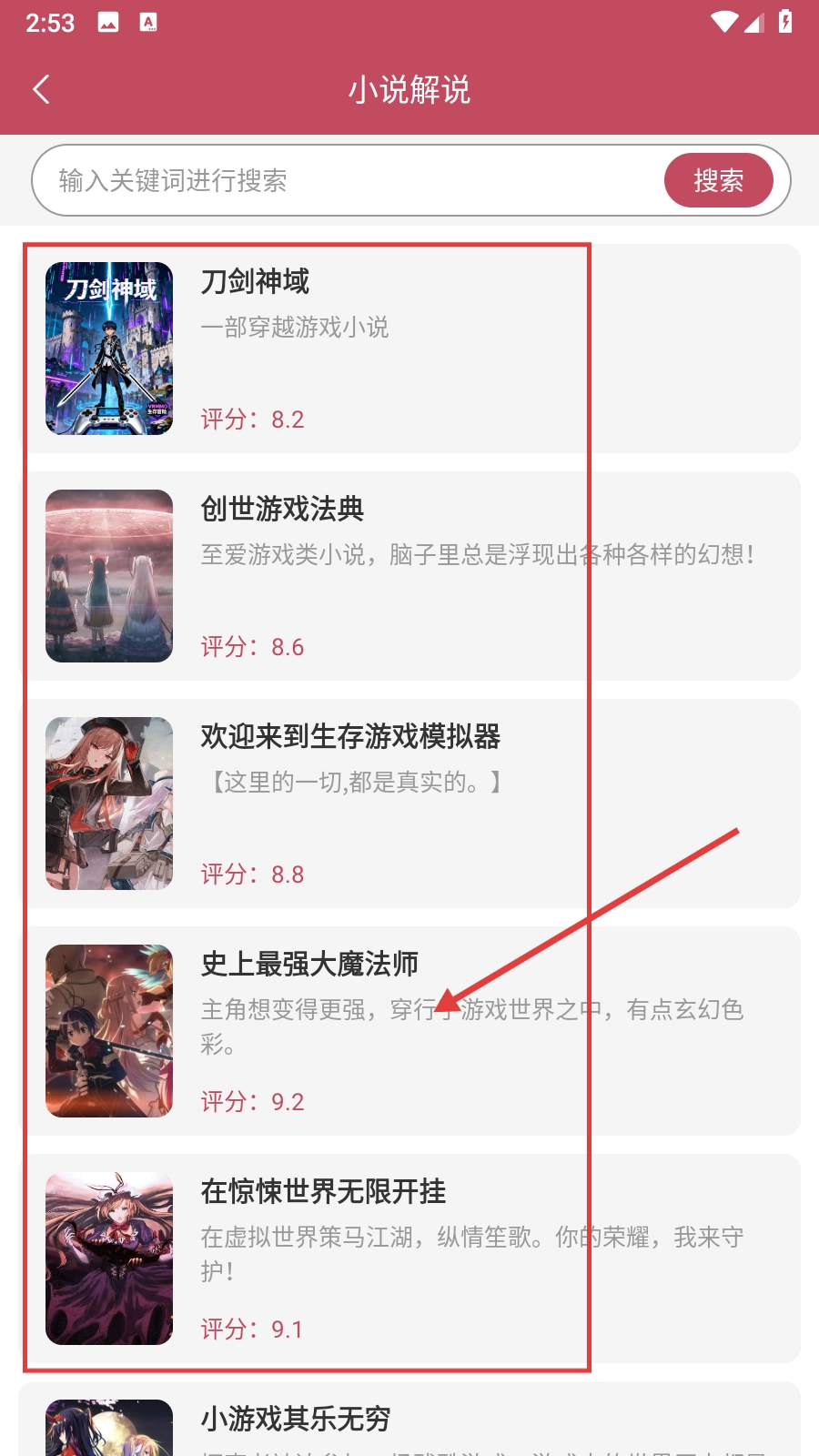 2、来到【小说解说】板块,既能够在搜索框内输入关键词来查找小说,也能够浏览推荐的游戏类小说,像【史上最强大魔法师】之类。