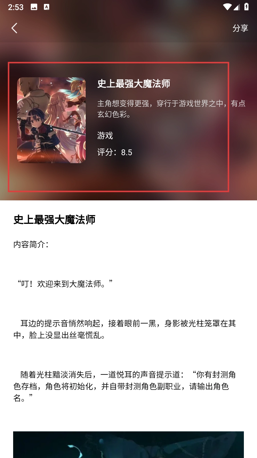 3、点击你感兴趣的小说,例如【史上最强大魔法师】,就能查看它的评分、简介等基础信息,从而了解小说的大致内容。