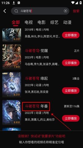 2. 在影视页面内搜索你想要观看的电影或者电视剧,以寻得目标视频。比如《斗破苍穹年番》