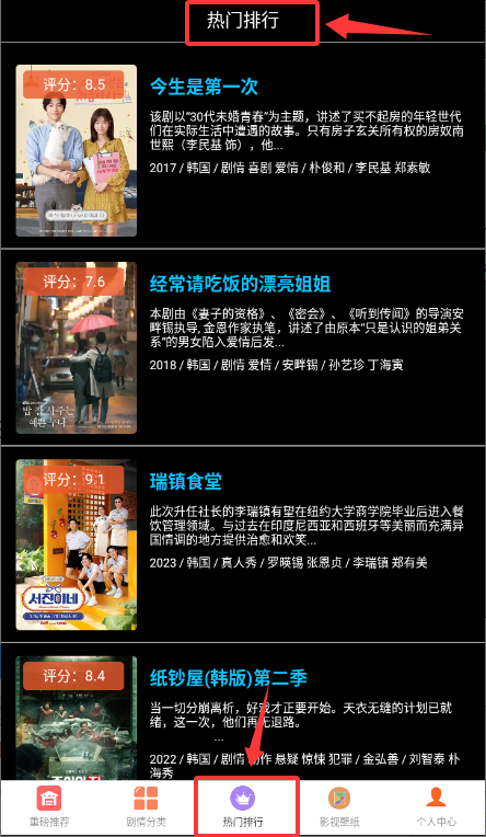 3、点击"热门排行"查看各类影视作品的排名信息。