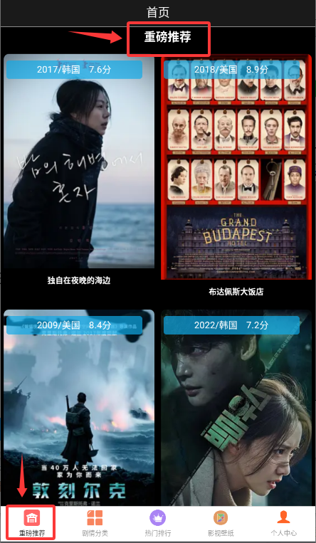 2、于首页选择"重磅推荐"功能,浏览精选影视内容。