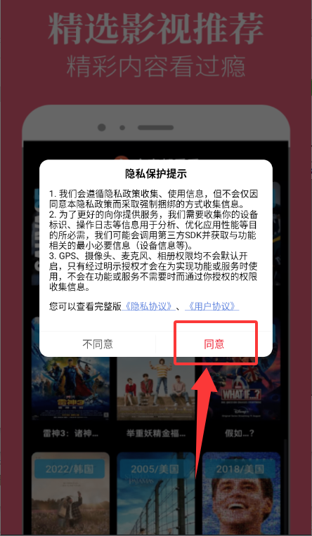 1、在隐私保护提示中点击"同意",即可进入应用。