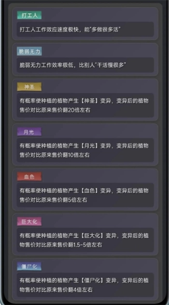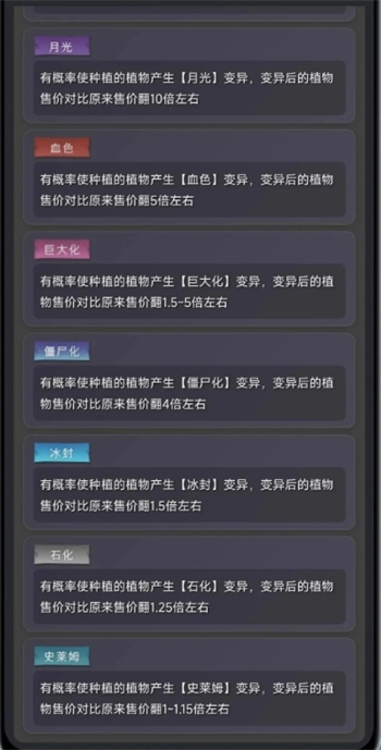 不同的词条对农场植物的售价影响都不一样,神圣17倍,月光10倍,血色5倍,僵尸4倍,巨大化1.5到5倍浮动按吨卖,冰封1.5倍,石化和史莱姆预计都是1.25倍,但是雪莲和魔芋石化和史莱姆后价格是亏损的