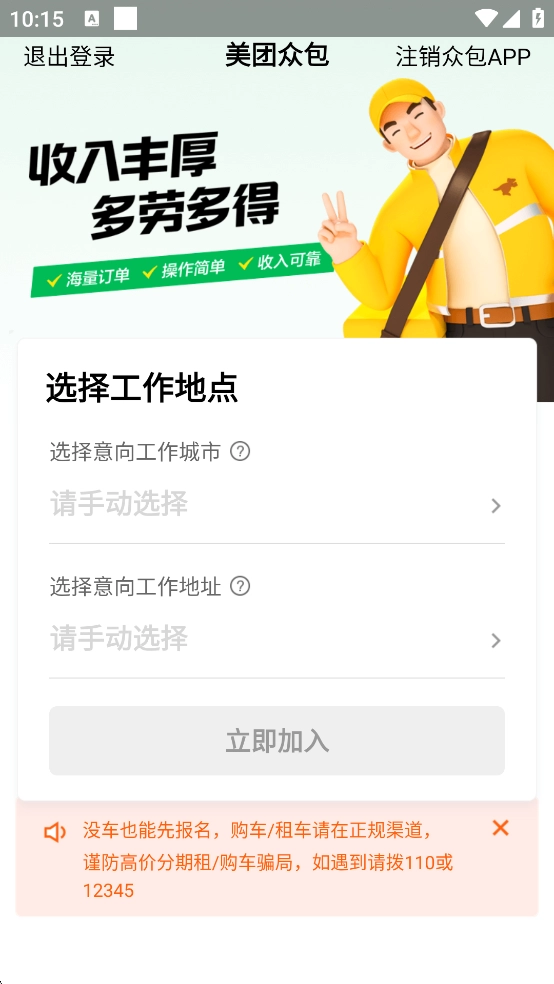 美团众包骑士是一款专门为兼职人群打造的专业配送接单赚钱软件,用户可以自行注册跑单,不需要缴纳任何费用。软件依托于美团外卖,每天有超过4000万配送订单等您配送,更有多重活动,对兼职及送餐助力!美团众包骑士长期保持兼职专职骑手招聘活动,注册即可开始进行配送兼职工作,单单结算,让您随时随地开赚,自我掌控时间!