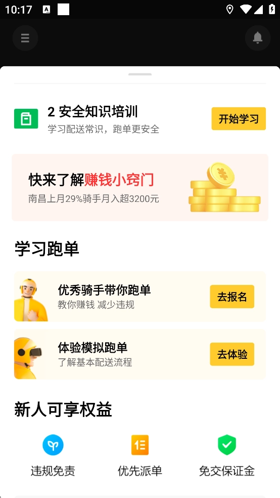 对纯新骑手,通过知识讲解,帮助小白骑手快速成长,掌握必备技能和平台规则,提升新手期体验;