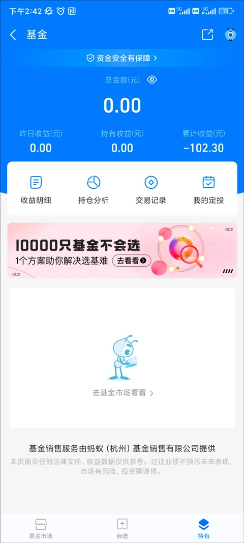 4、进入基金页面后,你可以在此查看自己添加的自选基金以及持有的基金。