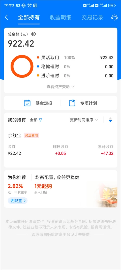 1从资金账户的管理维度而言,某综合理财平台的安全性处于较高水平。用户仅需通过单一账户,就能在该平台内完成货币基金、定期理财、黄金投资、各类基金产品等多种财富管理工具的操作与交易。