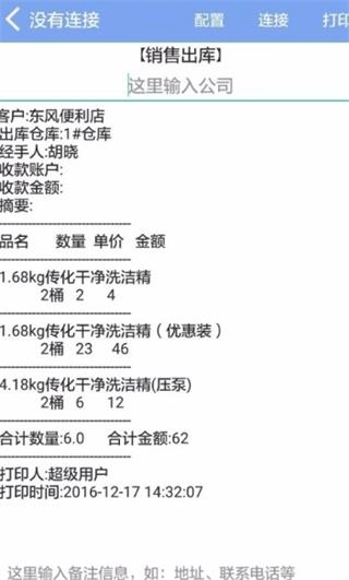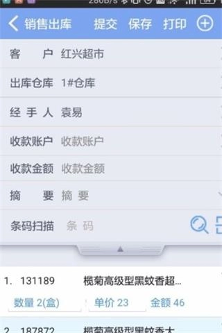 3、回到单据主体界面,如果需要单据打印,点打印即可,注意,需要蓝牙连接蓝牙小票打印机。点保存,是保存在手机端本地的。点提交,可以将单据传送到管家婆系统中,生成销售单草稿。如果物联通后台开启了单据过帐,单据将过帐,进入经营历程中。