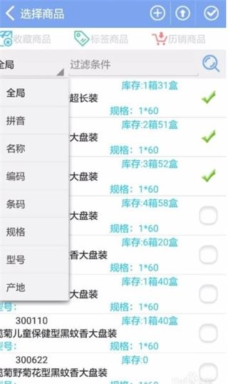 2、从上至下,表头中选择往来单位、仓库、经手人。点右上角“+”,选择商品信息,这里可以根据商品货号,名称,简拼,条码、规格、型号、产地进行过滤查询。单选或多选,点右角上"√",录入对应的数量、单价(单价也可以选择、可以开启价格跟踪),点右角上"√"。