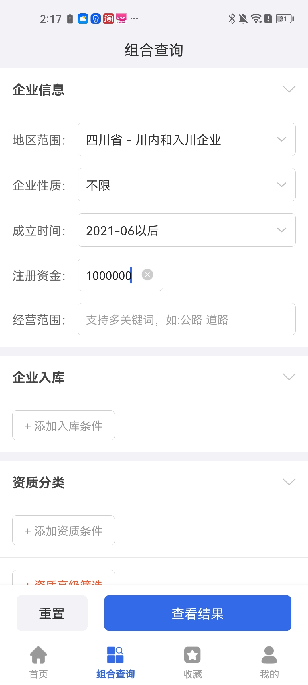 (1)组合查询功能界面中【企业信息】选项输入(四川省、川内和入川企业、注册资本金:1000万);