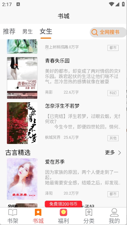 2、书城页面为用户推荐了当前热门的小说资源。