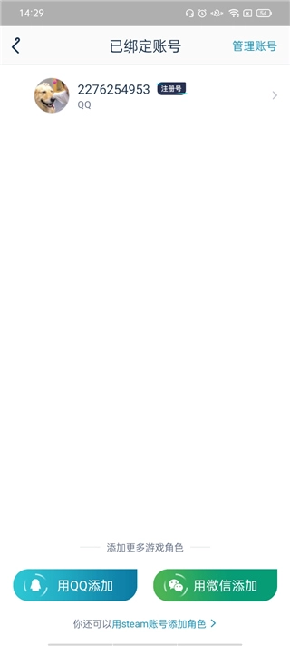 3、随后点击添加游戏或者角色,选择你的账号进行绑定,可添加多个游戏账号进行管理。