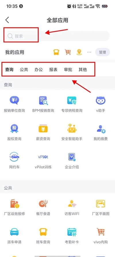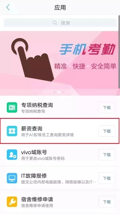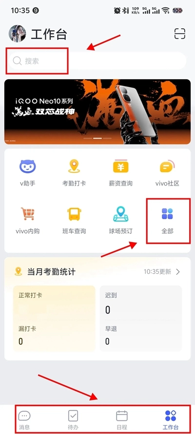界面显示所有聊天框,可通过顶部搜索栏,通过搜索姓名或工号,展开对话;工作台:涵盖V助手、考勤打卡、饭卡查询充值、薪资查询、vivo社区、vivo内购、班车查询、车辆权限申请等各项应用。