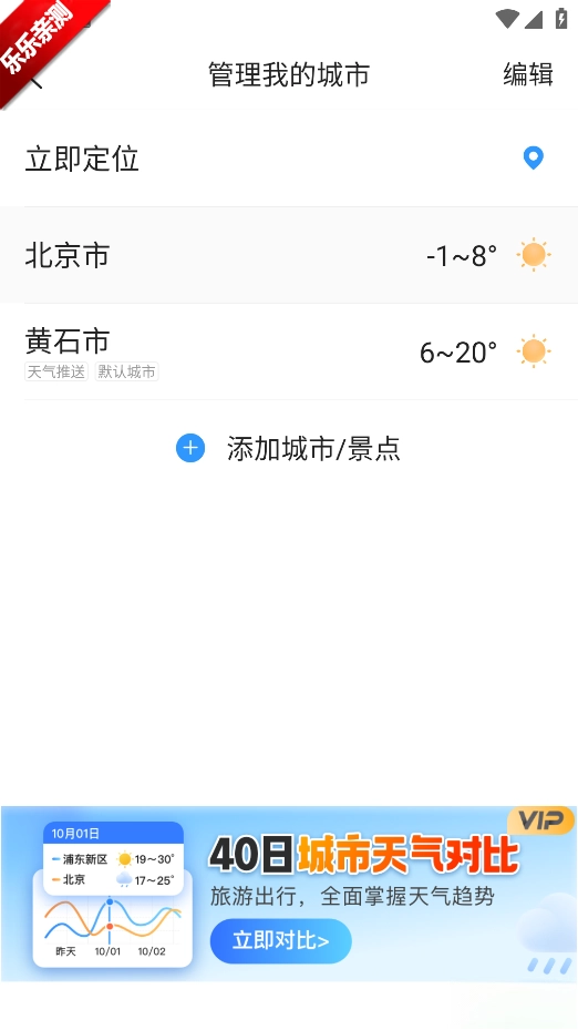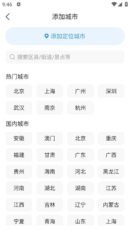 2.点击界面左上角 “+” 按钮,进入地区管理页面,输入目标城市或景点名称,即可添加该地区天气并随时切换查看。