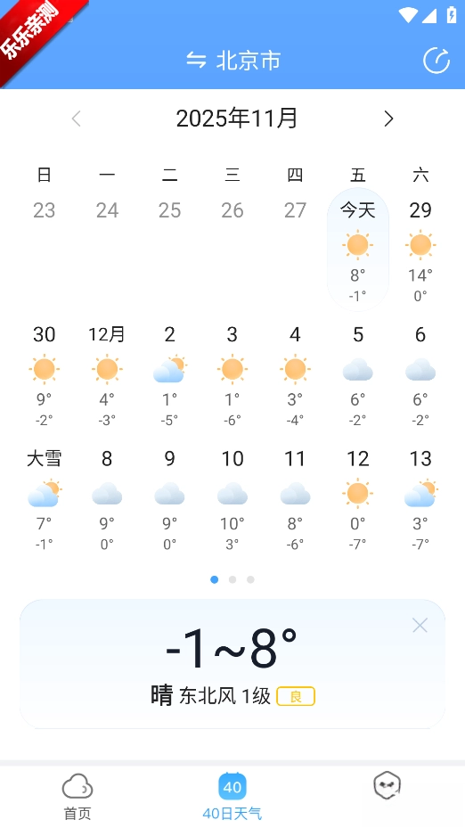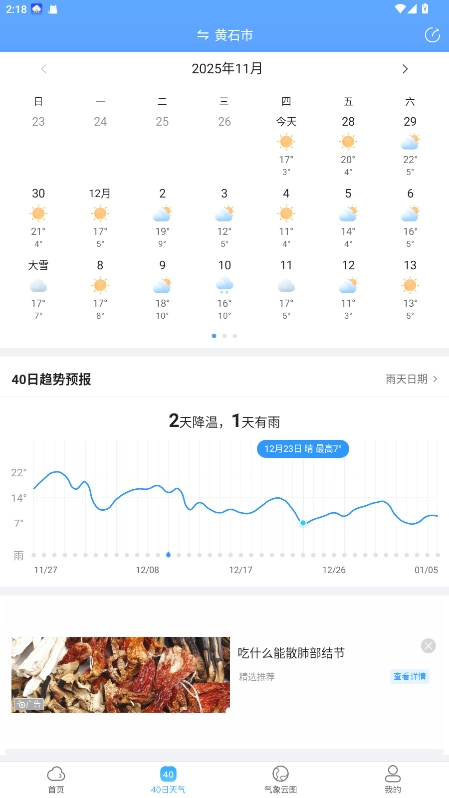 4.切换至长期预报页面,能浏览未来 40 天的温度变化、降水概率等信息,助力中长期行程规划。