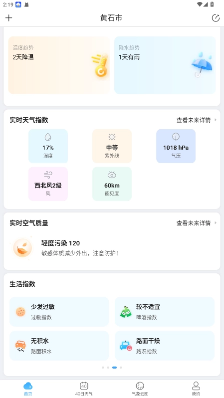 1.首次打开 时,允许开启高精度定位权限,系统会自动匹配附近气象观测站数据,显示当前所在地实时天气。