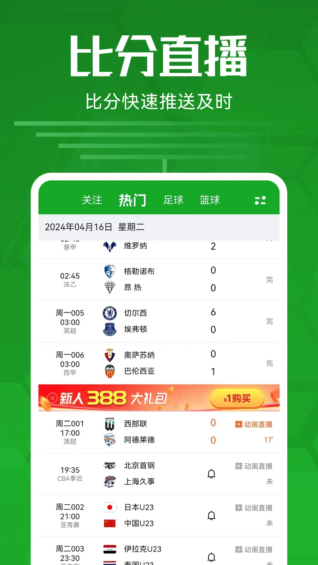 1、全球足球篮球赛事,即时比分,支持定制进球提醒。