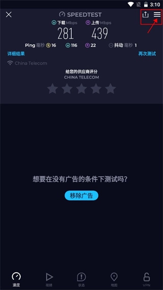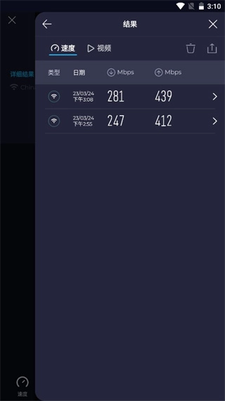 3、点击首页右上角的三条横线图标,就能查看每次测速的结果,测试时间也会清晰显示,这一功能设计得十分便捷。