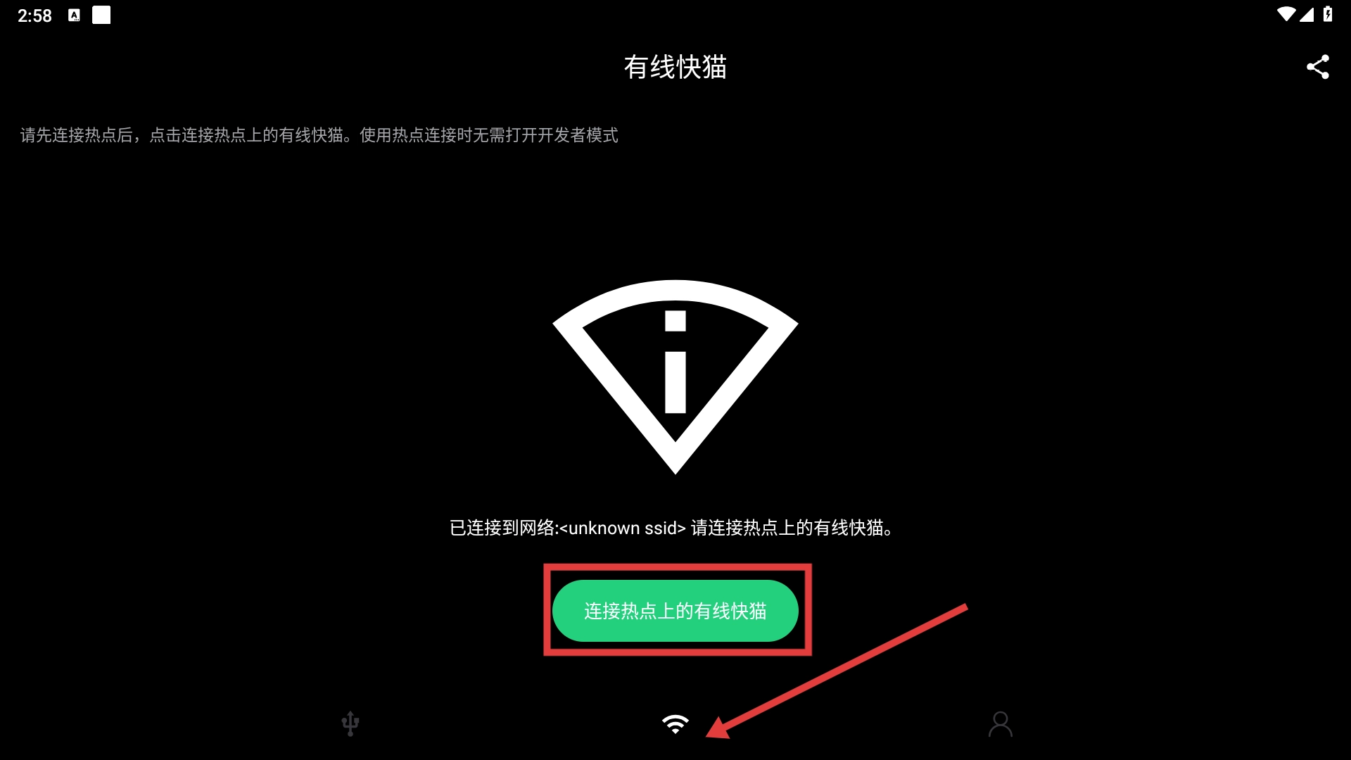 3、连接热点后,点击【连接热点上的有线快猫-按钮】,即可完成网络连接操作。