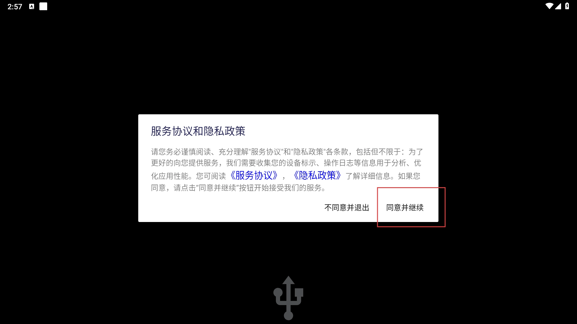 1、仔细阅读【服务协议和隐私政策-弹窗内容】后,点击【同意并继续-按钮】即可进入应用。