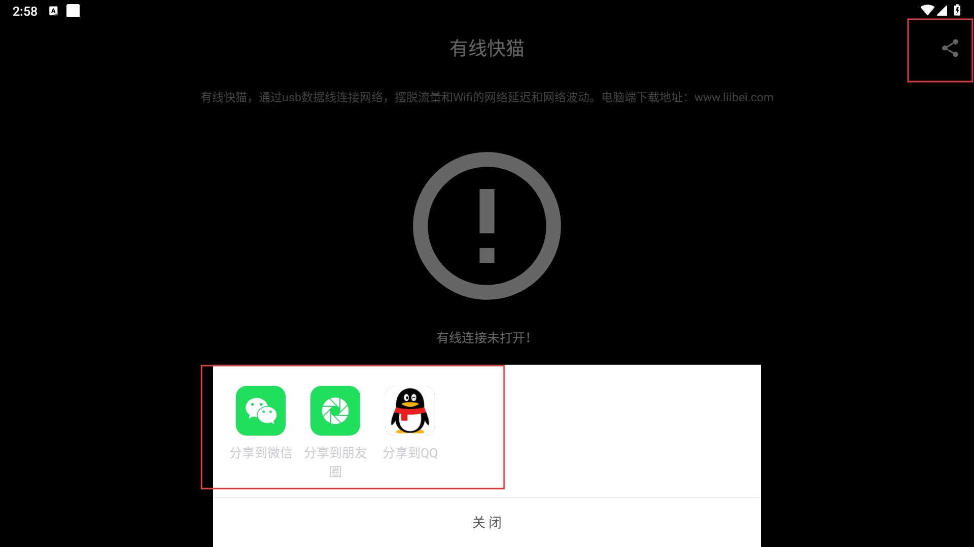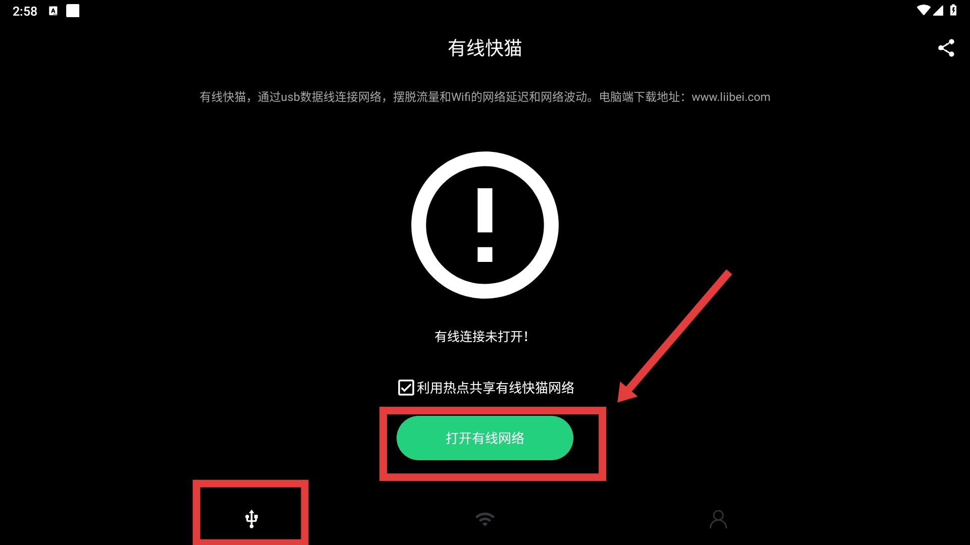2、进入【有线快猫】页面后,找到并点击【打开有线网络】按钮,尝试启动有线连接。