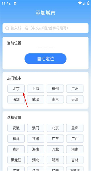1、启动软件后,进入添加城市的页面,在热门城市板块里找到北京,点击这座城市就能进入详情页面。