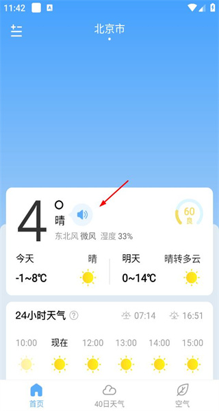 2打开显示北京地区信息的界面,了解当天的温度和天气情况,查看一天中各个时间段的天气动态变化。