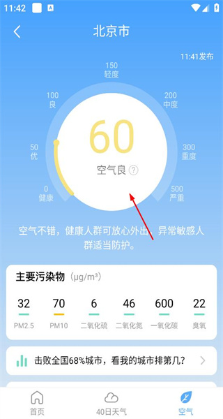 4打开空气质量相关界面后,可查看当前空气的具体等级和对应数值,知晓其中的主要污染物成分,并获取与之匹配的防护指引。