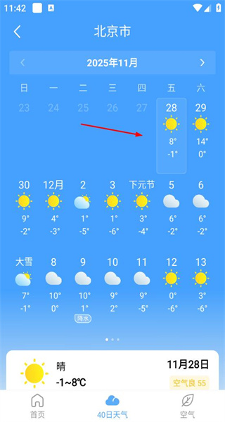 3、切换至11月的日历天气界面,查看28日当天的天气状况与气温数值,同时了解28日之后日期的天气趋势。