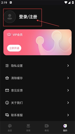 1、在【画室】主界面,点击底部导航栏的【我的】选项,就能进入个人中心页面,在这里可以查看登录/注册、会员开通等各类功能的入口。