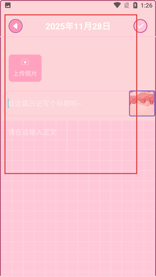 2进入编辑页面后,系统会默认选中当前日期(例如2025年11月28日),你可以点击【上传照片】按钮添加配图,同时也能填写标题和正文内容。