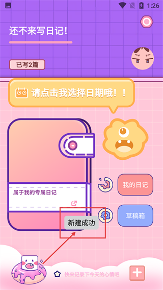 4、编辑完成后返回主界面,会出现【新建成功】的提示,与此同时“已写”的篇数会更新,还能通过【我的日记】查看已经发布的内容。
