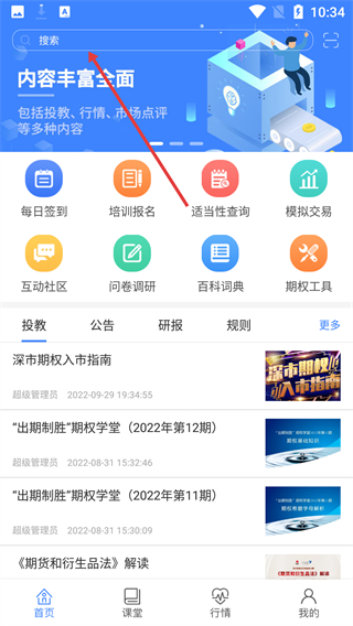 1打开应用后,在首页顶部找到搜索区域并点击,进入搜索页面后,输入相关关键词就能查找投教资料、行业资讯等各类内容。
