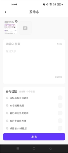 3、进入编辑页面后,先输入标题和内容,接着选择要参与的话题,最后点击“发布”选项就完成了。
