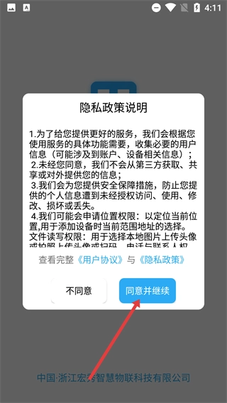 1在隐私政策说明弹窗里,仔细阅读条款内容后,点击【同意并继续】按钮,即可继续推进应用的操作流程。