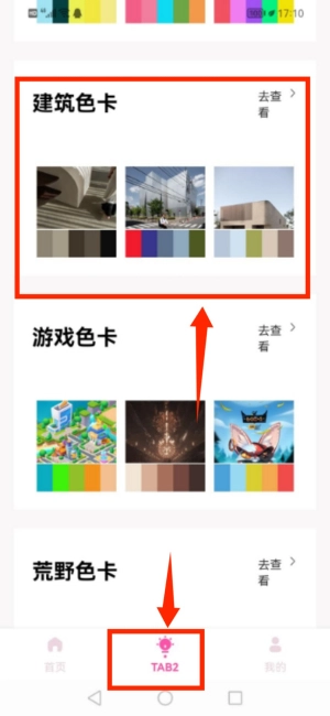 4、切换到TAB2页面,查看建筑色卡、游戏色卡等专业色彩分类内容。