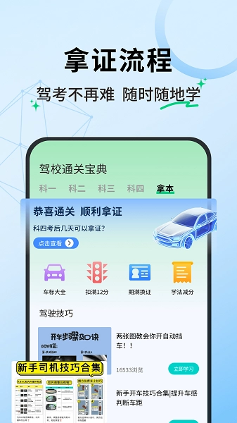 4、驾驶考试流程指南:这份指南涵盖了从注册、体检、考试预约到领取驾照的全流程指导,能让初学者清晰了解每一步操作,轻松上手。