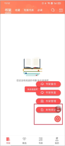 1、点击底部菜单栏的【书架】选项,找到右上方的“+”按钮并点击,然后选择本地阅读功能。