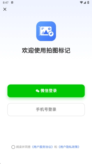 2、开启拍照标记功能,此步骤需先登录账号,支持微信登录与手机号登录两种方式;