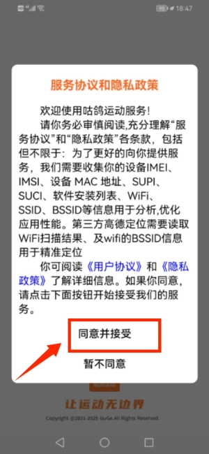 1、打开应用后,在服务协议弹窗中点击同意并接受,即可进入登录页面。
