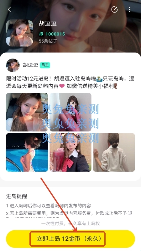 1登上岛屿后,你能够浏览岛上发布的各类内容。如果进入岛屿需要支付费用,该费用属于虚拟内容服务相关的支出,一旦付款成功将无法退还,建议你仔细确认相关信息后再决定是否进入岛屿。