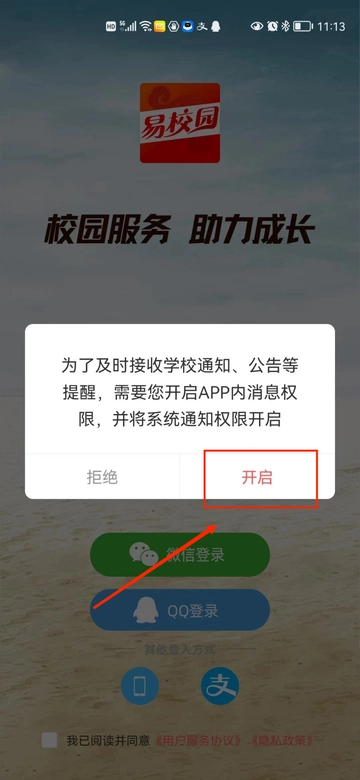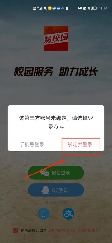 2完成安装后,可通过“微信登录”或“QQ登录”两种方式进入系统,需先启用相关权限。后续操作中点击“绑定并登录”,并在学校选择界面选定“青岛酒店管理职业技术学院”(该步骤为演示示例)。