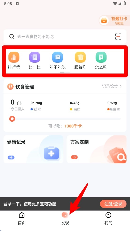 3、发现页可查看排行榜、食物对比等实用功能,帮助科学管理每日摄入饮食。