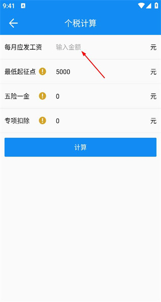 4进入个人所得税的计算界面后,填写每月的应发工资数目,确认起征点等相关信息无误,再点击计算按键就能获取最终的计算结果。