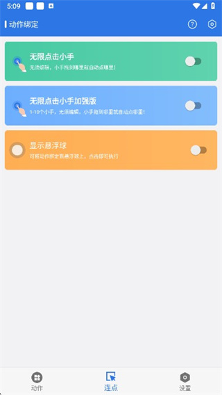 小明连点器是一款专业实用的手机连点工具软件,提供无限点击小手、无限点击小手加强版、显示悬浮球等动作绑定选项,还配备了对应的操作教程,用户可根据自身需求进行设置。该软件能够模拟屏幕点击操作,拥有快速连点、循环点击、手势录制等丰富功能,既能满足用户多方面的使用需求,又能解放双手、提升办事效率。