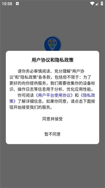 1、打开奇思妙想记单词,会弹出“用户协议和隐私政策”提示框,阅读后点击“同意并接受”继续使用;