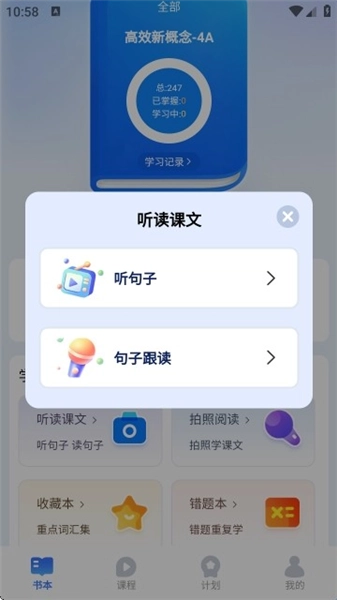3、点击“听读课文”,可选择“听句子”或“句子跟读”,训练听力和口语表达。