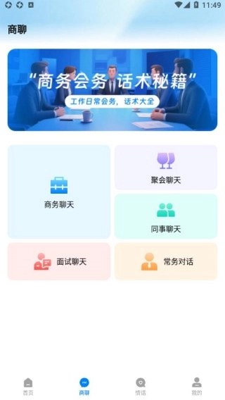 3在商务交流相关的板块中,汇集了丰富多样的商务沟通话术素材,能帮助用户学习并掌握更多实用的聊天技巧,以便在互动时更加灵活高效。