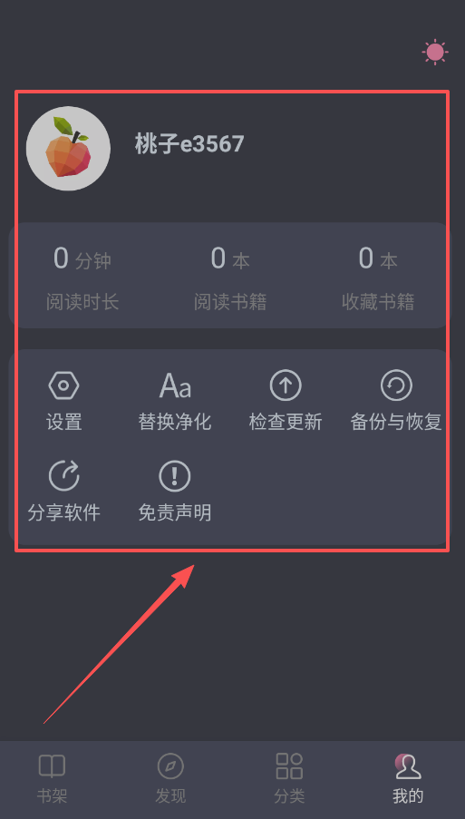 1、使用这个软件很简单,底部四个标签就是核心,找书去“发现”和“分类”,管理你的书和设置则去“我的”页面。